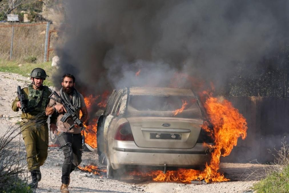 fire to a Palestinian car at dawn, on October 14, 2025.