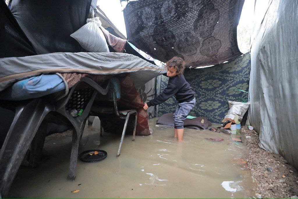of freezing cold in her family's rag-tent, in Khan Younus,